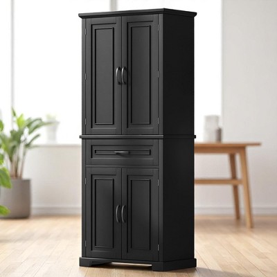 Upgrade your home storage with this tall black bathroom storage cabinet featuring a modern rectangular silhouette and a painted MDF finish. Designed with functionality in mind, this freestanding cabinet includes a two-door upper cabinet with adjustable shelving and two large lower drawers for extra storage. Its elegant design and versatile use make it ideal for bathrooms, offices, kitchens, or hallways.