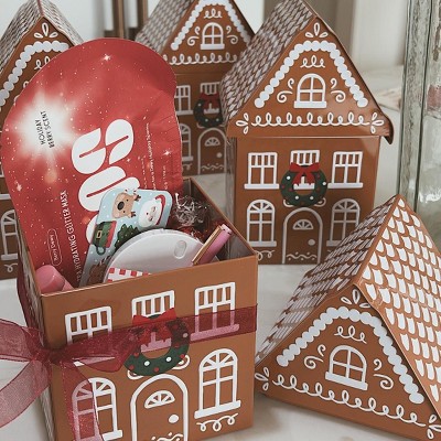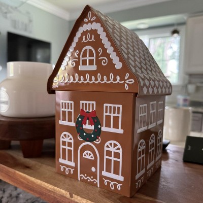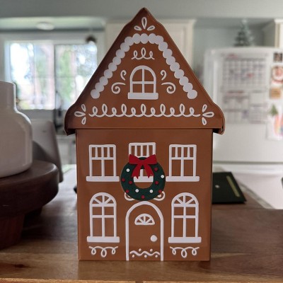 Your friends and loved ones will be excited to open gifts placed in this Tall Christmas Gingerbread House Tin Gift Box from Wondershop™. This tall Christmas gift box is designed in a gingerbread house shape featuring bow-tie wreath detailing on the front for festive appeal. Made of metal, the gift box is perfectly sized to hold a variety of holiday presents.