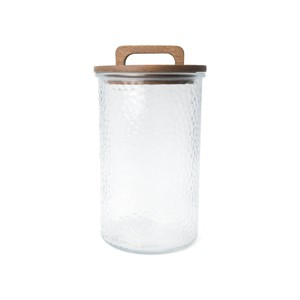 Store your essentials in style with the Tall Hammered Cannister from Bullseye's Playground. Crafted from durable glass, this elegantly clear container with a wooden lid is perfect for keeping your kitchen countertop organized. Its sleek design not only adds a touch of sophistication but also ensures the contents remain fresh. Ideal for displaying or storing a variety of items, this cannister offers both functionality and aesthetic appeal to your space.