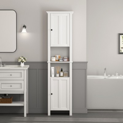 Tall Narrow Storage Cabinet with 1 Drawer & 3 Doors - Features adjustable shelves, open shelf & metal handles for bathroom, kitchen, or living room.