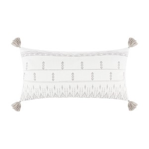 The Embroidered Tassel decorative pillow matches perfectly with the Levtex Home Tamiya bedding collection. This pillow is sized at 12x24in. and features intricately grey embroidered geometric design on a white ground with tassel corners. The white and grey color palette makes this a versatile accessory for your bed, couch or favorite chair. The pillow comes pre-filled with a soft, luxurious feather inner.