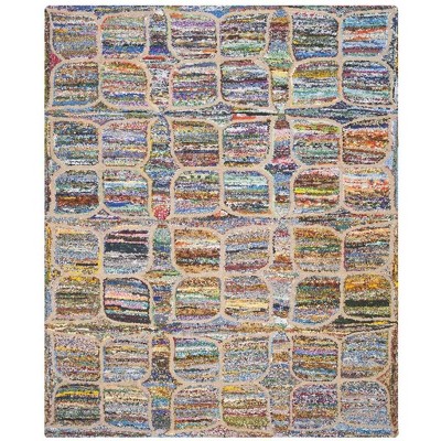 A: The rug features a striped design in tan, blue, and orange, adding visual interest to any space.