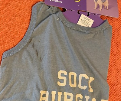 Add quirky fun to your pet's closet with the Tank Sock Burglar Dog Shirt from Boots & Barkley™. This dog shirt features the text "Sock Burglar" for a fun and humorous touch. Made of a recycled polyester fabric blend for a soft feel, this sleeveless dog shirt has a pullover style for easy on and off. Plus, it's machine washable for easy cleaning.