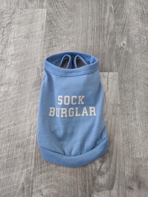 Add quirky fun to your pet's closet with the Tank Sock Burglar Dog Shirt from Boots & Barkley™. This dog shirt features the text "Sock Burglar" for a fun and humorous touch. Made of a recycled polyester fabric blend for a soft feel, this sleeveless dog shirt has a pullover style for easy on and off. Plus, it's machine washable for easy cleaning.
