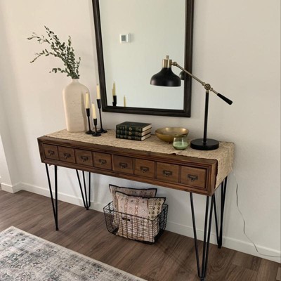 The Picket House Furnishings Tanner Storage Sofa Table is the perfect addition to your home! This rectangle sofa table comes with two drawers, ideal for storing away any belongings that need a home. The apothecary style drawer fronts on this table add extra flair to this already stylish table and it pairs perfectly with the hairpin legs. The dark metal legs complement the light walnut finish beautifully. This table can not only be displayed in your living room, but it will also make a great entry way table. Along the front edge, you'll find beveled edges adding a classic touch to this transitional design.