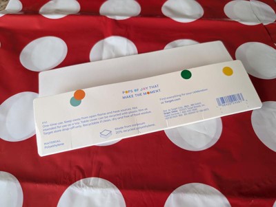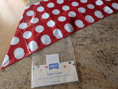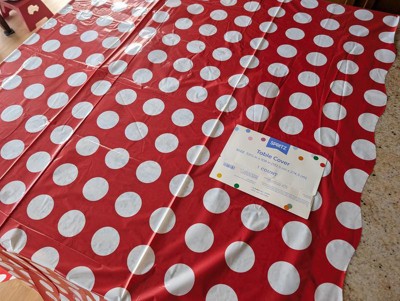 Got this very joyful red and white polka dots table cover from Spritz. It's a thin plastic polyethylene cover, designed for a one time use, to cover a large rectangular table for a party. While the cover is claimed to be made from at least 20% recycled polyethylene, it's also recyclable if it's clean, and both the cover and its plastic film can be recycled at a Target store drop-off.