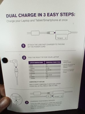The Targus Laptop Charger with USB Port is a 90-Watt adapter that allows you to quickly charge a laptop and tablet or smartphone at the same time. Sized for travel, this charger comes with a 2.4A USB Fast Charger that connects right to the cable, making it easy to plug in a USB compatible device (like an iPad or tablet) and charge it alongside the laptop. Built-in power supply protection ensures safe use with over voltage, over current, and over temperature protection to keep all of your mobile devices safe from unexpected surges and spikes. This reliable adapter includes 5 connector tips to support Acer, Asus, Compaq, Dell, Fujitsu, Gateway, HP, Lenovo, and Toshiba right out of the box.