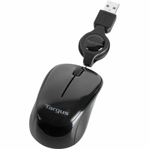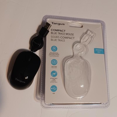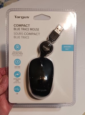 The Targus Compact BlueTrace Mouse is the perfect solution for travelers who need to save space when using an external mouse. The integrated scroll button allows you to scroll up or down through spreadsheets or browse the internet. The Blue Trace technology combines the power of an optical mouse with the precision of a laser mouse for remarkable tracking on almost any surface. The retractable cord adjusts allowing users to choose the length needed to save space in compact work environments. Featuring a standard USB connection, the mouse is ready to work out of the box. The sleek black and gray design provides added style, while the contoured shape provides ergonomic support for left and right handed users. At only 3" long, the Targus Compact Mouse is small enough to conveniently carry in a laptop bag for comfortable mousing on the go.