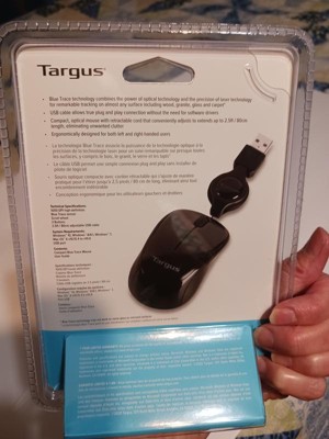 [This review was collected as part of a promotion.] The Compact BlueTrace Mouse from Targus is extremely handy and very easy to use (plug and play using a USB port on your laptop). Its Blue Trace Technology (optical and laser) makes it work effortlessly on almost any surface (granite, wood, glass, even carpet). The retractable cord is great way to eliminate "all those extra cords". This compact mouse is a godsend! I highly recommend it.