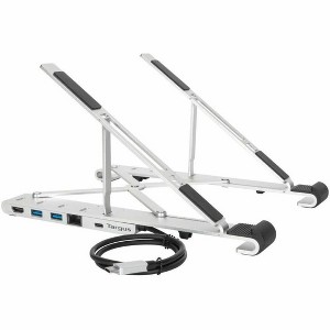 Stylish and durable, this Targus® Portable Stand with Integrated Dock is made with aluminum that is designed to be foldable to an ultra-compact size (25.3 x 6 x 1.83 cm), perfectly stowed within a Targus® backpack or laptop case of the modern mobile worker who's looking to transform their laptop into a workstation at multiple workspaces. Robust construction with aluminium not only offers a sturdy platform for your laptop, it also has high heat reduction characteristics to help prevent your device from overheating. Plus it can be adjusted 5 different positions so that your laptop screen stays in your eye line for the most optimum working posture to reduce back and neck strains. Ensure to maximise your productivity wherever you work and simply connect your laptop to an extra monitor up to 4K 30p, plus other peripherals with one single USB-C cable. The Targus® 100W PD GaN Wall Charger (APA109GL) is the perfect companion for this stand with integrated dock, delivering up to 100W power when connected to the USB-C port under the stand, the power then shared between the Laptop via USB-C cable and other connected devices or accessories. Keep organised whilst working on the go and centrally connect your keyboard, mouse, external flash drive or smart devices via 2x USB-A and 1 USB-C data ports that all support up to 5 Gbps data transfer rate, ideal for mobile working in multiple locations.