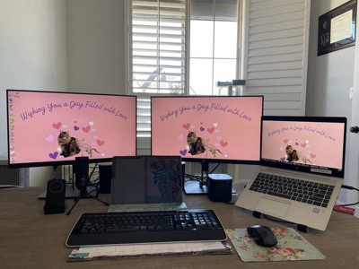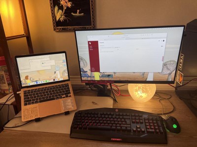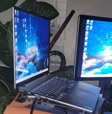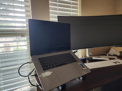 [This review was collected as part of a promotion.] I work remotely and all of my security VPN and drives are on my laptop but I have a giant gaming monitor I could never use since I didn’t have enough ports on my MacBook to dock it in. This saved the day. Now I can use my laptop with a dual monitor situation and save my neck and back from pain. I love the ability to see things bigger and have better productivity. The stand itself is very sturdy and quality made. It’s not heavy but is very solid and I love how it can fold so I can use it when I travel. Love it!!! Make your home office work for you. Also the stand still fits my MacBook with the protective case on it!
