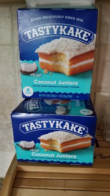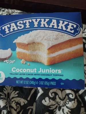 - Tastykake Coconut Juniors are moist yellow layer cakes with a rich frosting and coconut topping