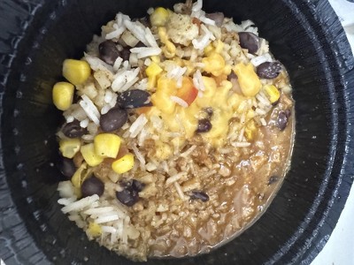 precooked rice (rice, water) , sauce (vegan cream [water, coconut oil, potato starch, salt, acidity regulator: glucono-delta-lactone, flavor, olive extract, vitamin b12], coconut milk, jalapeno in brine [green jalapeno pepper, water, salt, vinegar, acetic acid, potassium sorbate and calcium chloride], lemon juice from concentrate, chili powder (spices [including chili peppers], paprika, salt, garlic, silicon dioxide [anti-caking agent]), lime juice from concentrate, salt, cumin, granulated garlic), plant based mexican beef crumble (water, pea protein, coconut aminos [coconut syrup, white cane vinegar, salt], coconut oil, rice flour, molasses, chili powder (spices [including chili peppers] paprika, salt, garlic, silicon dioxide [anti-caking agent]), tomato powder, onion powder, dried cumin, garlic powder, black pepper, cocoa powder), precooked cauliflower, precooked black beans, precooked corn, vegan cheddar cheese (preparation made by rice [water, germinated brown rice, salt, apple vinegar], water, coconut oil, lemon juice, paprika extract, vegetable lactic acid, thickening agents: agar agar, arabic gum, xanthan gum, carob flour, natural flavoring), tomato, red onion, white onion, jalapeno pepper, cilantro.' '