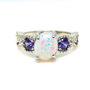 • Captivating Centerpiece: Features an 8mmx10mm oval-shaped simulated fire opal, radiating an ethereal play of colors, complemented by purple CZ stones.