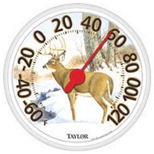 The Taylor Deer Design Dial Thermometer, 13.25 inch molded dial design depicting a majestic deer in the snowy wilderness. Framed in a glossy black bezel and iy is large, easy-to-read dial displays temperatures range-60 Fahrenheit to 120 Fahrenheit. It is shatterproof and weather resistant materials, this ensures durability, adding both practicality and charm to spaces.