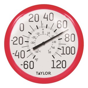 Attractively framed in a red bezel. Shatterproof and weather resistant. Big and Bold Wall Thermometers boast a classic look with a sleek and sophisticated frame. Blends in perfectly with any indoor or outdoor décor. The thermometer has a shatterproof lens designed to withstand harsh elements without compromising visibility. Precision thermometer coil features a wide temperature range from -60ºF to 120ºF (-50ºC to 50ºC).