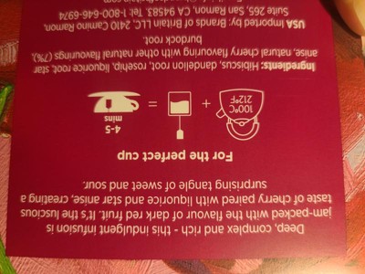 This fruit/herbal infusion is pretty good! Definitely has strong undertones of licorice, so if you are not a licorice fan this will not be the beverage for you. But if you enjoy cherries and licorice, you will probably like it!