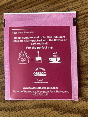 The perfect tart cherry fruit flavored infusion for an afternoon pick me up. Taylors Of Harrogate is a certified carbon neutral product. The box contains 20 individually wrapped and tagged tea bags for ease of use.