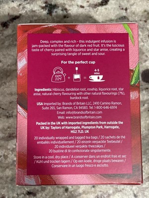 - Taylors of Harrogate Sour Cherry Herbal Tea contains 20 individually wrapped and tagged tea bags (3 boxes: 60 tea bags total).
