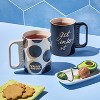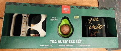Whether you're celebrating a special occasion or simply spreading joy, this 3-Piece Tea Business Gift Set from Tabitha Brown for Target is an ideal gift choice. This set includes an avocado-shaped tea infuser plus two ceramic mugs, with one mug featuring "get into it" text on a black backdrop and the other featuring a polka dot pattern in black and rose gold hues on a white backdrop. Suitable for serving hot or cold beverages, the mugs are microwave safe and dishwasher safe on the top rack for easy reheating and cleaning.