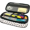 Teacher Created Resources® Black Painted Dots on White Pencil Case | The stylish pencil case can expand and hold approximately 50 pens or pencils. Case is sturdy, durable, and has multiple zippers and pockets. Measures 9" L x 4-1/4" W. Wrap-around expansion zipper allows thickness to go from 1-3/8" to 2-1/2" in an instant! Front pocket keeps frequently used item easily accessible. Store small items in a zippered mesh compartment. 5 elastic pen slots keep pens or brushes from moving.