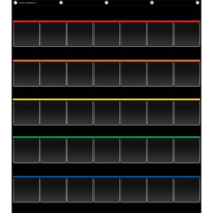 Teacher Created Resources® Black Storage Pocket Chart, 35 Pockets, 32.5" x 63.5" | These lightweight and durable pocket charts feature colorful designs and hang easily from sturdy, metal grommets. 35 clear pockets measure 4.5" x 4.5" each and are perfect for organizing small items such as calculators, index cards, cell phones, white board erasers, and manipulatives. The non-porous surface is easy to clean and can be wiped-down or sprayed with disinfectant to help prevent the spread of germs. Measures 32.5" x 36.5".