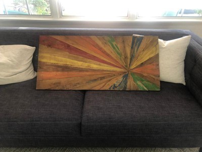 - This rustic style inspired teak wood abstract wall decor comes in a creative sunburst pattern design by arranging teak wood pieces cut in long triangles to form this stunning abstract art