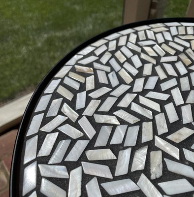 Love this table! Very sturdy & high quality. Doesn’t feel cheap at all. The top mosaic pieces on the table top look mostly white with a opalescent appearance, but matte, not shiny. High quality looking. The legs have a matte black smooth, nice finish Took 2 mins. to screw legs onto table top. So glad I purchased this! I am using as an extra side table beside a chair, but I might also put a plant on it from time to time as it would work perfectly as a lovely plant stand.