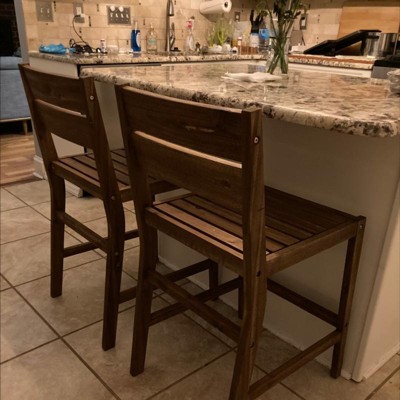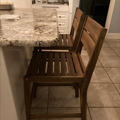 The chairs were easy to assemble and great quality wood. I coated them in the outdoor min wax to prevent water damage as we use them on a covered porch area. The height was perfect for what we are using them with a counter height bar top.