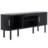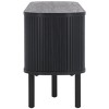 Lend a sophisticated update to any room with our stylish and functional Tealla media stand. Its linear profile and sleek rounded edges lend practical elegance and charm to any room. It features tambour doors on each side for added style and functionality. Each door slides horizontally to provide easy access to its spacious and roomy cabinets. The gold pulls of the cabinet create a warm contrast with the black finish of the storage unit. The central shelf includes a glass door to offer space for display while hiding all your essentials behind the sleek cabinets of our media stand.
