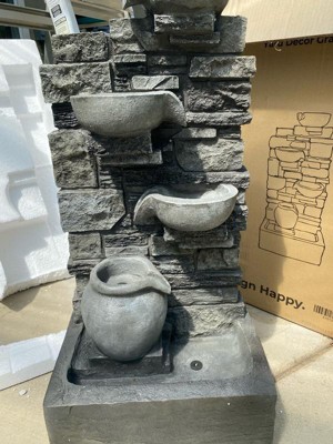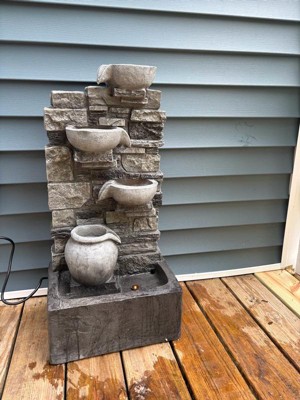 This stunning 4-tier cascading water fountain is crafted from durable, weather-resistant polyresin and features a faux brown stacked stone wall that adds a touch of natural beauty. Four textured vessels, staggered down the wall, create a continuous flow of water, while LED lights illuminate the water from underwater for a mesmerizing glow at night. Includes a water control unit, power cord, and a cover for the back to protect the interior from debris.