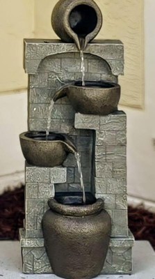 - Water cascades bowl to bowl to a rocky base below