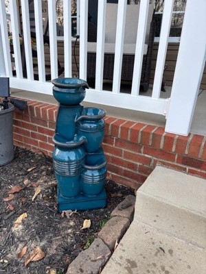 Bring the serenity of flowing water to your patio, garden, or deck with this captivating solar-powered Teamson Home 28.74" Outdoor 4-Tier Cascading Bowl Solar Fountain. The gleaming teal blue finish with brown distressing adds a touch of rustic charm to any outdoor living space, while its contemporary design elevates the aesthetic with a modern flair. This water feature includes a solar-powered pump and LED lights to create a unique visual as the three lower tiers are illuminated underwater.