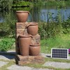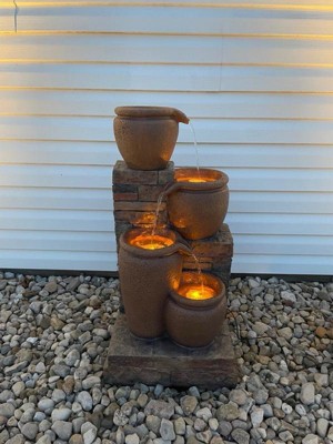 Create a relaxing oasis in your outdoor living areas with the Teamson Home 30.71" 4-Tier Solar-Powered Outdoor Water Fountain. Four textured jars are staggered on a faux brick pedestal allowing water to trickle its way down this rustic addition to your patio, deck or garden. This decorative water features includes a solar-powered pump and LED lights submerged in the water for a unique visual at night. The rugged veneer and multi-brown finish add depth to your decor.