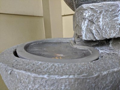 [This review was collected as part of a promotion.] This resin fountain is an attractive and relaxing addition to any space outdoors. Set-up was simple and only took me a few minutes. I initially installed this fountain indoors, and filling the water reservoir took a couple extra minutes, but if you install it outdoors, a hose would fill the reservoir quickly. I was excited at the addition of this relaxing fountain indoors, but it wasn’t meant to be. Despite switching around the pump flow settings and adjusting the water level, I was unable to remove the splashing completely, so I had to move this fountain outdoors. The noise level is appropriate and relaxing for outdoor use, but a bit overwhelming for indoor comfort. The included screens are needed (indoors and outdoors) to achieve a relaxing noise and to keep the fountain from getting clogged. Unfortunately, the filters are ill-fitting for my fountain; the top screen does not fit well and the rim of the bottom screen splashes unless I leave minimal water in the fountain. The screens are not visually appealing for me, but without them, the water noise is not nearly as pleasant as with the screens in place. The three replaceable and always-on LED lights produce a calming effect, especially during dim lit evenings. There is no on/off switch, rather a power cord that is plugged in at a GFCI outlet. The instructions suggest turning off/on as little as possible to extend the life of the pump, so please keep this in mind when finding a location for your fountain. The fountain has great potential to spruce up any space and create a relaxing atmosphere, but I would recommend it for outdoor use only.