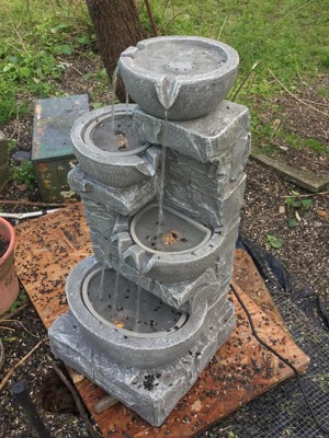 [This review was collected as part of a promotion.] I got this outdoor Stacked Stone Tieted Bowl Foutain with led lights. When I took it out of the box I was amazed how beautiful it is. Easy to assemble. Just had to plug the lights into the pump and insert the tube for the fountain. Put the mesh on each of the tiers. So beautiful!! I look forward to sitting beside it this summer listening to it.