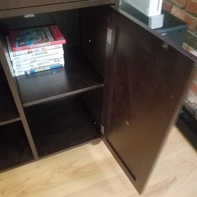 [This review was collected as part of a promotion.] We love this espresso colored floor cabinet! It fits nicely in our living room and we are using it for video game and DVD storage. The unit was so easy to assemble, my 10 and 7 year old were able to help my husband! I love the shelves and the cabinet allowing for nice decorating options, which I have yet to do!