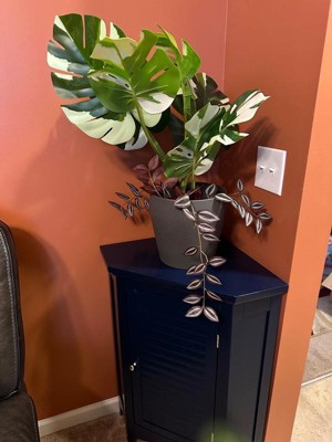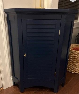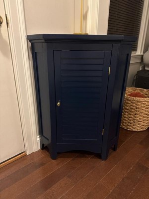 Teamson Home's Glancy Freestanding Corner Floor Cabinet features a finish, a crown molded top and skirting, shaker-style legs, and a faux louvered door. This stylish cabinet's unique shape and size adds more storage space than a regular wall cabinet and features an interior shelf to help organize everyday items for easier access. Includes magnetic latch that operate silently, eliminating clicking or slamming noises. Ideal for bathrooms, kitchens, laundry rooms, and more.