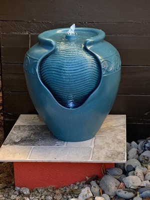 Create a relaxing oasis with the Teamson Home 17" Contoured Vase Floor Fountain. This decorative waterfall fountain features a pottery vase design in a turquoise blue glazed finish to add tranquility to your indoor or outdoor space. The built-in soft white LED lights illuminate the fountain to add ambiance to your decor, and the soothing sound of running water flowing along the vase provides a relaxing atmosphere while blocking out other noises. The durable polyresin and fiberglass construction is weatherproof and rust-resistant for long-lasting indoor or outdoor use. This fountain includes a pump, 72" cord, and all parts needed for quick and easy setup. This free-standing fountain measures 15.5" x 15.5" x 17" to fit in compact outdoor areas.