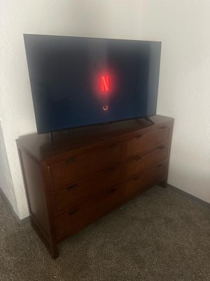 Smooth drawer glides and anti-tip kit offer safe and easy everyday use, ensuring a stable setup even on imperfect surfaces. Engineered for quick setup and long-term stability in high-traffic rooms, making it safer for homes with kids pets or high-traffic spaces. Wide top surface and deep drawer interior offer practical storage, maximizing both display space and hidden capacity. Mixed wood design includes acacia veneers, MDF and pine wood, delivering the strength of real wood with enhanced everyday performance. This Dresser blends display storage and durability in a design made to work as hard as it looks.