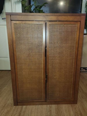 [This review was collected as part of a promotion.] Really happy with this over the toilet cabinet. It looks sleek and stylish. the black finish and rattan details give my bathroom a nice modern touch. The shelves hold quite a bit (I keep extra towels, toiletries, and a few decor pieces on them). It’s sturdy once assembled, though putting it together took a bit of time. The PU leatheredge doors are a cool detail I wasn’t expecting to like as much as I do. Overall, a great space saver that’s both practical and good-looking. Would definitely recommend!