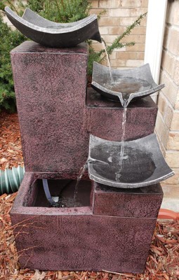 [This review was collected as part of a promotion.] This fountain is perfect on my patio. There’s no tools needed for assembly and putting it together was simple. The fountain is distressed and textured. There’s 3 levels the water flows to. The sound and look of the water flowing is tranquil and relaxing.