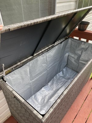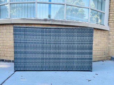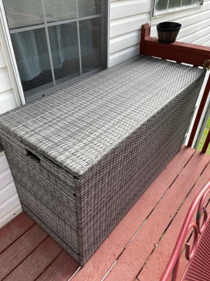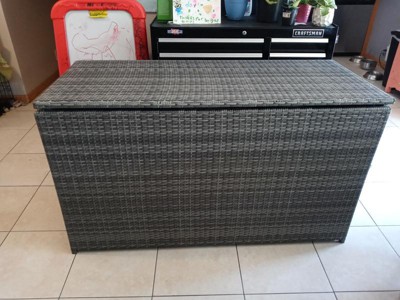 This soft gray 154-gallon storage chest is built for any outdoor entertaining space. Includes built-in handles, water-resistant liner, and soft-close hinges. Expertly crafted of strong gray PE Rattan and wicker for long-lasting use season after season.