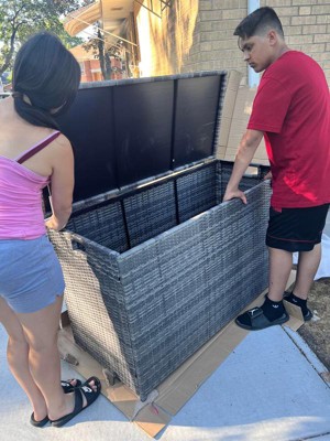 [This review was collected as part of a promotion.] I received the Teamson Home Wicker 154 Gallon Patio Storage Chest, Gray and my daughter and I put it together. It was so easy to put together and the instructions were very easy to follow along. It's very sturdy and durable and absolutely love the gray color. It comes with the tarp that goes inside to keep things dry and safe from getting any damage. It's has so much space that actually hold all 6 pillow cushions, garden tools, and all kinds of different outside items and still has room. We absolutely love this product and looking for another to put out in our front yard. Love this product! 10 out of 10!!