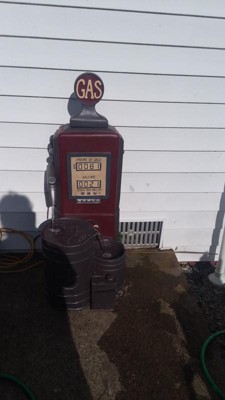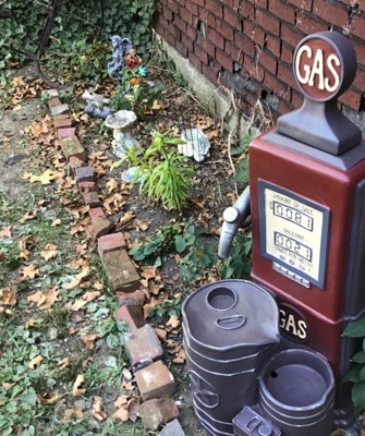 - Vintage gas pump surrounded by aged cans to create a cascading water feature