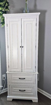 Upgrade your home storage while adding modern style with the Teamson Home St. James Wooden Linen Tower Cabinet with 2 Drawers. This decorative cabinet features a sleek white finish with a crown molded top and a minimalist silhouette for a beautiful addition to your space. The 3 included interior shelves and 2 bottom drawers make this cabinet a functional solution to your storage needs. Constructed from durable engineered wood, this storage unit is built to provide you with long-lasting organization. Easy, step-by-step instructions and all of the hardware needed for installation are included for quick assembly. Purchase this stylish linen cabinet alone or with other items from the St. James collection for a cohesive, updated look.