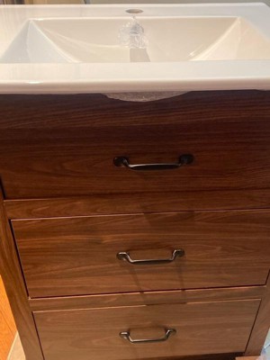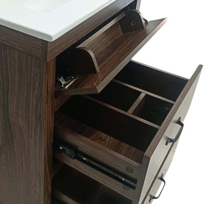 The sleek 24" Donovan single sink vanity features three unique drawers for organization and a contemporary square-shaped ceramic sink. With a detailed Light Oak paper laminate finish and rustic-style matte black pulls, this vanity is compatible with single-hole, centerset faucets only (not included). Features three different self-closing drawers: the top flips down, convenient for toothpaste and brushes, a middle drawer U-shaped to accommodate plumbing, and a full-sized bottom drawer for towels.