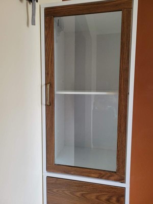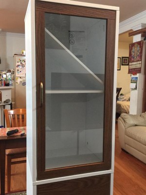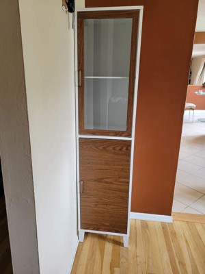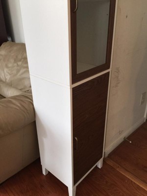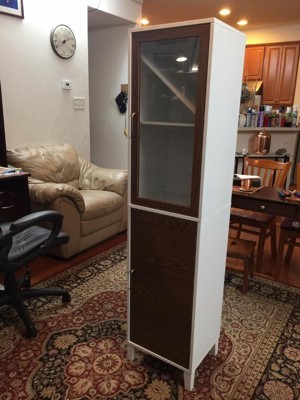 [This review was collected as part of a promotion.] I have been looking for a thin tall cabinet for my bedroom. This worked out amazing! Very easily put together took me a total of 15 to 20 minutes. Very sturdy pure white color with the Brownwood a glass door amazing