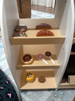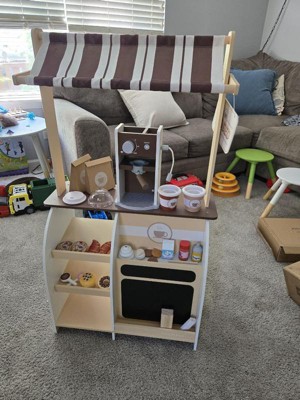 [This review was collected as part of a promotion.] Oh my gosh this espresso coffee cart is so cute. It comes with many accessories including the espresso machine, different style “coffee” beans, so many cafe style treats, chalk, and an open sign. The accessories are interactive. You put the coffee beans into the coffee press and it “dispenses”. The frother is magnetic also. All of the accessories are wooden except for the treat bags which were paper. Unfortunately the bags came apart literally within minutes of first play. The coffee cart was easy to put together and the instructions were easy to follow!