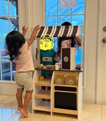 Brew up hours of imaginative fun with the Teamson Kids Espresso Coffee Stand. This wooden café playset lets little baristas brew, serve, and sell drinks and treats—just like a real coffee shop! With a striped canopy, open shelving, and a chalkboard sign, it brings creative café play to life.